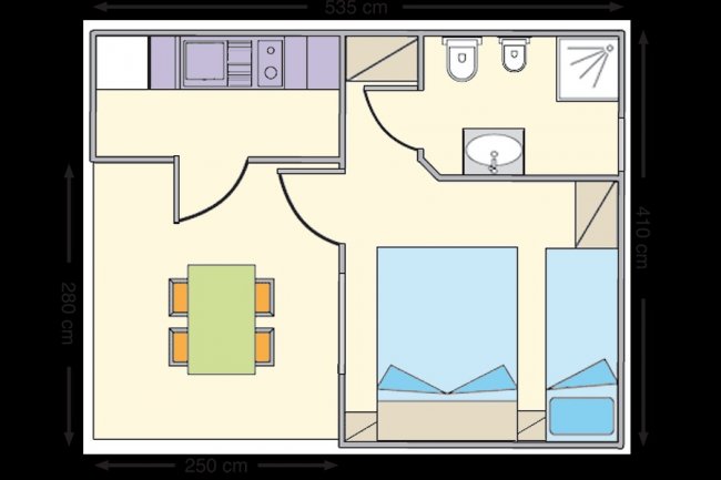 Planimetria di una casa mobile con stanza e cucina.