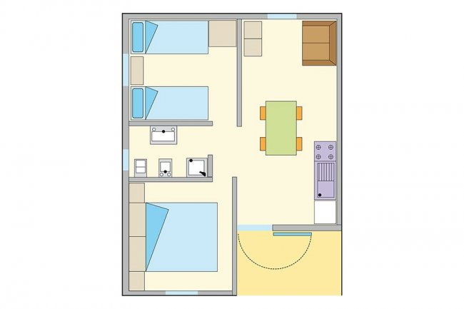 Piantina di una casa mobile con due letti e area giorno.