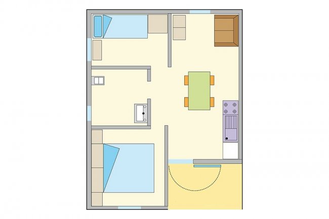 Piantina di un appartamento con due camere e cucina.