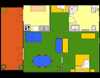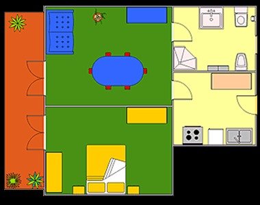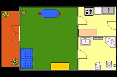 Planimetria con soggiorno, cucina, bagno e due camere, spazio esterno con piante.
