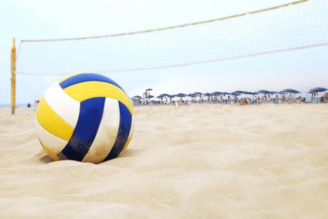 Palla da volley su una spiaggia sabbiosa con rete e ombrelloni blu sullo sfondo.