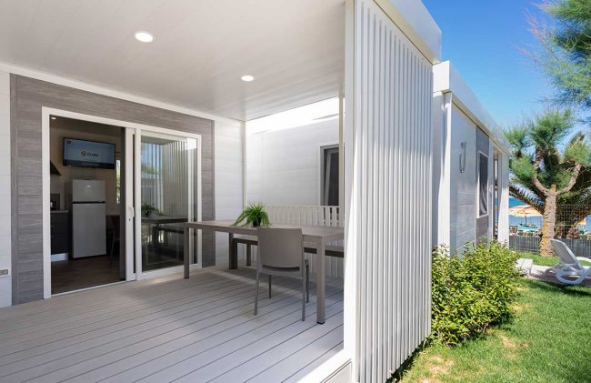Trilocale di 24 o 32 mq con soggiorno con angolo cottura, camera matrimoniale,camera con letto signolo e uno a castello, aria condizionata, tv, bagno completo di tutti i servizi, area esterna.