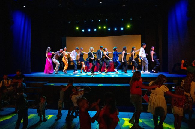 Persone ballano su un palco illuminato.