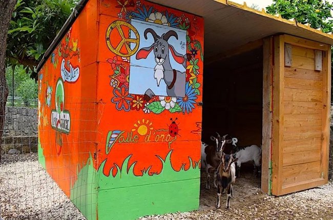 Capanno arancione decorato con disegni colorati e capre.