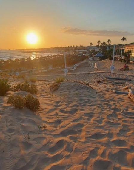 Tramonto su una spiaggia sabbiosa con ombrelloni e palme.