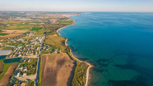 Vista aerea della costa con campi e insediamenti lungo il mare.