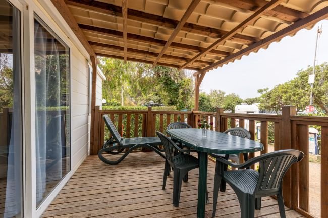mobile home con doppia terrazza esterna attrezzata con splendida vista mare. Dispongono di aria condizionata, tv, salotto con dinette trasformabile in 5° letto, camera matrimoniale, camera con due letti singoli, bagno privato con doccia in ogni camera. La cucina è completamente attrezzata con piatti e stoviglie ed è completa di fornelli a gas e frigo.